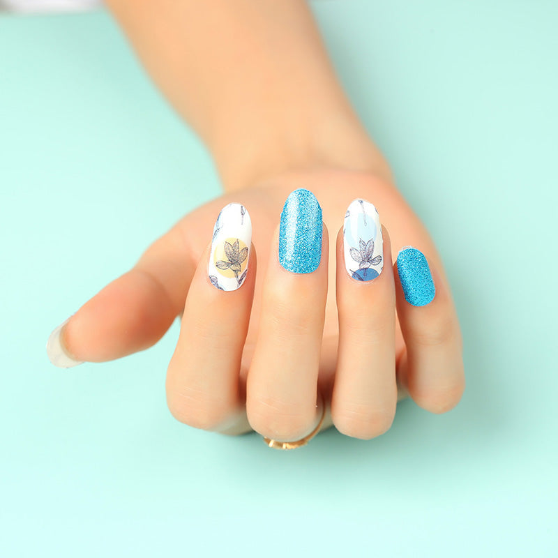 Un design poétique et naturel: Offrez à vos ongles une touche florale avec ces motifs délicats sur fond bleu et jaune pastel. L’élégance des fleurs dessinées à la main crée un style frais et raffiné, idéal pour le printemps.