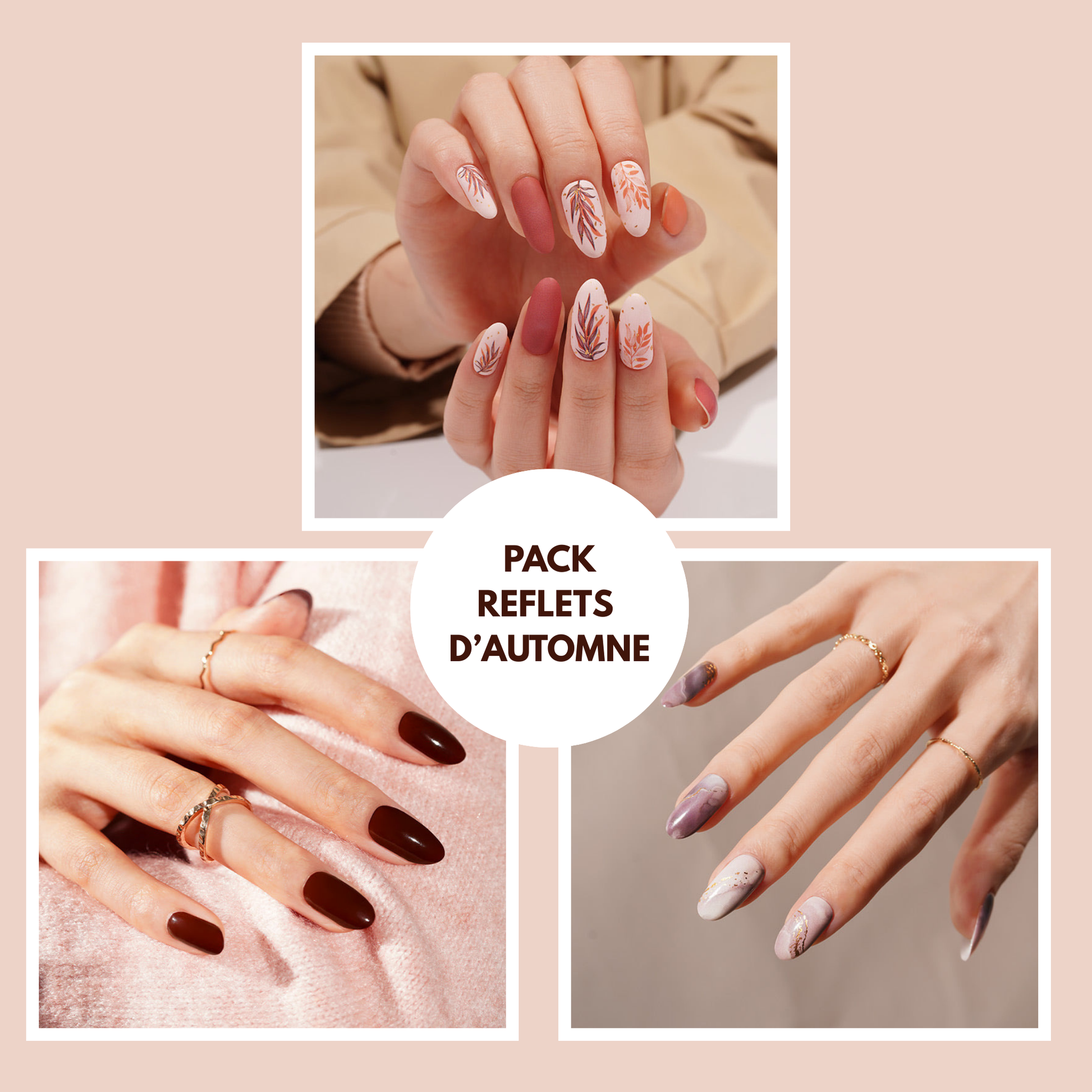 Un marron chocolat intense, un marbré mauve sublimé d'une fine touche dorée et un motif feuillage automnal raffiné. Trois manucures qui réchauffent vos looks et accompagnent vos journées avec style.